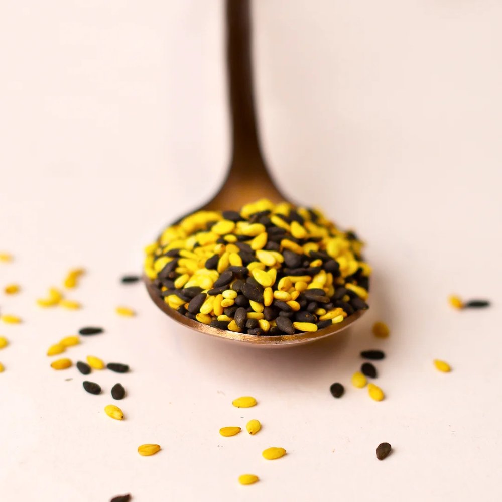 Dual-Tone Garnish: A beautiful mix of black and yellow-spiced seeds for professional-grade food presentation.